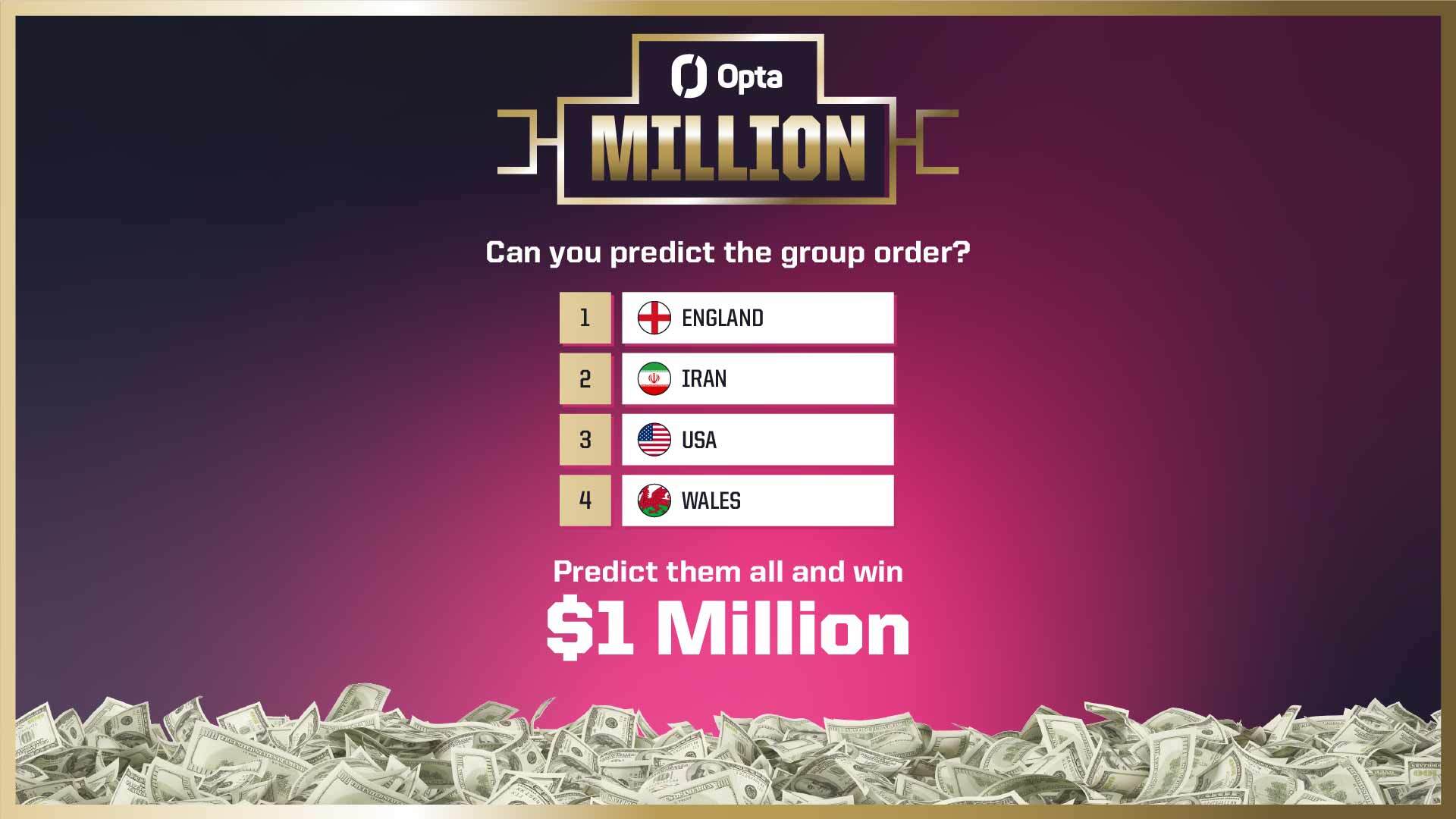 | You don't have to travel across the world to enjoy this year's World Cup. Play the Opta Million bracket challenge from the comfort of your couch, then watch the action and start practicing your celebration if you emerge victorious. Find out how you can win. |