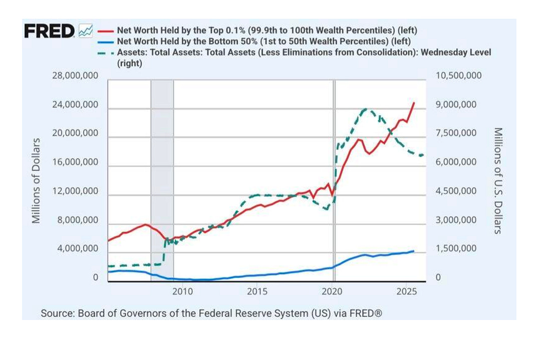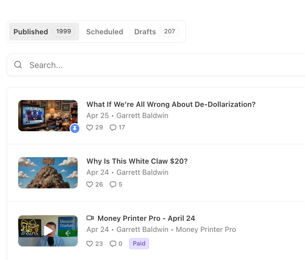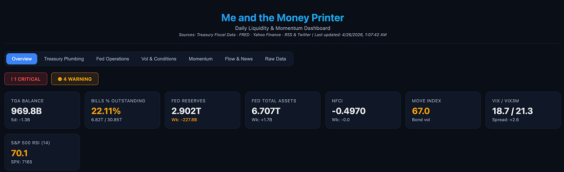 You are a free subscriber to Me and the Money Printer. To upgrade to paid and receive the daily Capital Wave Report - which features our Red-Green market signals, subscribe here. Dear Fellow Traveler: Another tie… The Blue Jays had their third tie in lacrosse this year. And my daughter is starting to like this sport. Two things happened… one good and one worrisome… The latter was that my daughter played goalie a second time, let up a few goals, and made a terrific save. Now, she wants the pads, the backyard goal, and me to shoot on her because she thinks it’s fun… And with that… I have resigned, and we are (for now) raising a lacrosse goalie, a trait she has inherited from her father. For a moment, lightning hit my brain, and I thought… This will be an experience... But then, right after the game, we ran into the family of a girl who is in her class. And the girl was at her brother’s game AFTER her travel lacrosse game. And with an 8 or 9 years old, I couldn’t help but think of anything that I didn’t want to do less than attend travel lacrosse games - 20 or 25 minutes away from home … on a Monday night, and two 90-minute (yes… 90-minute) practices a week… I could see how tired these parents were… I remembered that being a goalie requires little running… it requires little travel… so we can and should just remain in the local rec league and let her continue to play goalie - right where she is… Everyone maximizes their time. Plus I avoid the travel parents… The lacrosse goalie position shaped the way I think… the way I approach the world… and the way that I view markets… I hope it does the same for her in the future. Let’s get to the charts… Chart 1: Momentum Is Strong, Breadth is WeakOver at MoneyPrinterPro.com, our S&P 500 signal remains very strong, but you’ll notice a red flag. The Equal Weight figure sits at 41, while the Cap Weight is at 118.6. This is broader market momentum anchored by deep concerns about breadth. If that cap weight starts to drop fast - that’s a sign of unsustainability at the top of the S&P 500 food chain, and would signal a higher probability of a coming reversal. The Cap weight turned positive before the Equal weight did on April 7, and the markets have been screaming higher since. The Russell reading turned positive on April 6, despite all my concerns about Iran, and the never-ending chorus of bearish sentiment. CTAs started buying… momentum was real… Access to the reading (which turned negative on January 28 before the gold/silver crash and broader market selloff) is part of the paid subscription to this Substack. Subscribe now and add it to your arsenal… Chart 2: The Cantillon Effect in Yet Another ChartWe start this week with the post-2008 world we live in. Here’s the chart that lays out the impact of the Cantillon Effect and monetary expansion in the post-GFC era. The printer goes BRRRR…. the top 0.1% has seen a similar expansion in “wealth.” I know that a lot of us were told that the gains were because they were creating jobs and building businesses… But that was just a throwback to our 1980s standard. Today, monetary expansion is a core driver of the issue. And they live in the pipes. It’s only going to accelerate… Chart 3: Maybe We Should Follow the MoneyIt wasn’t long ago that people were shaking their fists at the sky after the White House announced it was taking a strategic interest in Intel Corporation (INTC). That investment was in 10% of the company, valued at a little less than $9 billion, at under $20 a share. Well, in the wake of that investment, Intel has surged and has now gotten back above its Dot-Com highs. All the clues were there… but the bias among many was strong… It’s a reminder that public policies can be massive tailwinds. The Trump administration’s silent Chip War with China and the prioritization of Intel’s Foundry business were supportive. This is a reminder why it’s so important to watch policy… and to listen to what is happening on K Street down in Washington D.C. Recall that we made a similar call on ASML in 2024 due to the Trump administration. Shares are now up more than 70% since we gave away that report. Chart 4: The Dollar Isn’t DeadThis is a big one… turns out that the de-dollarization movement has hit a snag… Yesterday, I wrote a lengthy piece on the subject and how it relates to stablecoins, but this is quite a data point. The dollar’s use in trade has hit new highs during this war, according to data from Swift Not just up during this war… but also up after we shut down Russia’s reserves… Chart 5: They’re Doing The Thing…Recently, I explained the importance of watching Treasury auctions… they buy back longer duration, illiquid bonds, and then shift the lending to the front of the curve… If the Treasury Department feels like it’s an actively managed hedge fund… it’s because a hedge fund manager is running it… I went to TreasuryDirect yesterday to see what’s going on… but it seems that no one was at the door when I knocked… So the solution was to just create a portat that we’ll add soon to Money Printer Pro… The Treasury General Account, by the way, is starting to drop… Chart No. 6: Well… That’s Not GoodRecently, I wrote a piece about Seigniorage at the Federal Reserve. The Fed made money for years and years just creating money because there’s a big gap between the cost of printing a dollar bill and the “market value” of the bill. But for the last few years, with rising rates and other hindrances, the Fed has been LOSING money… almost like they’re trying to win a competition… As I’ll explain in Postcards tonight, that Seigniorage will be shifting toward the stablecoin operators... That comes with risks… but it’s very significant. Chart 7: And The Second Worst Momentum Stock Is…We slapped a ranking on all 502 stocks in the S&P 500 by weighting them against six academic mome